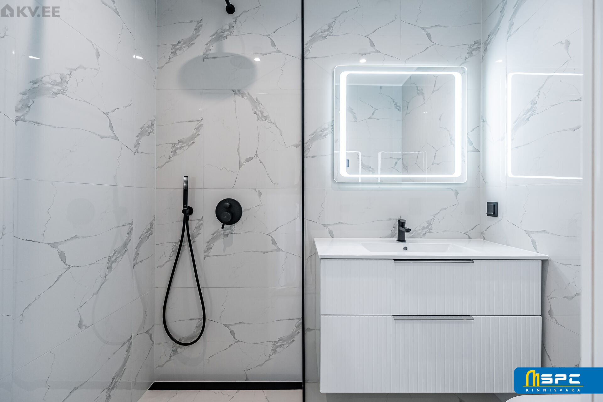 – Kaasaegne duširuum: Viimistletud kvaliteetsete marmorimitatsiooniga suurte plaatidega. Läbimõeldud valgustuslahendused (LED-valgustusega peegel), põrandaküte, pesumasin, kvaliteetne sisseehitatud (!) sanitaartehnika ja mugav eraldatud klaasiga dušiala.