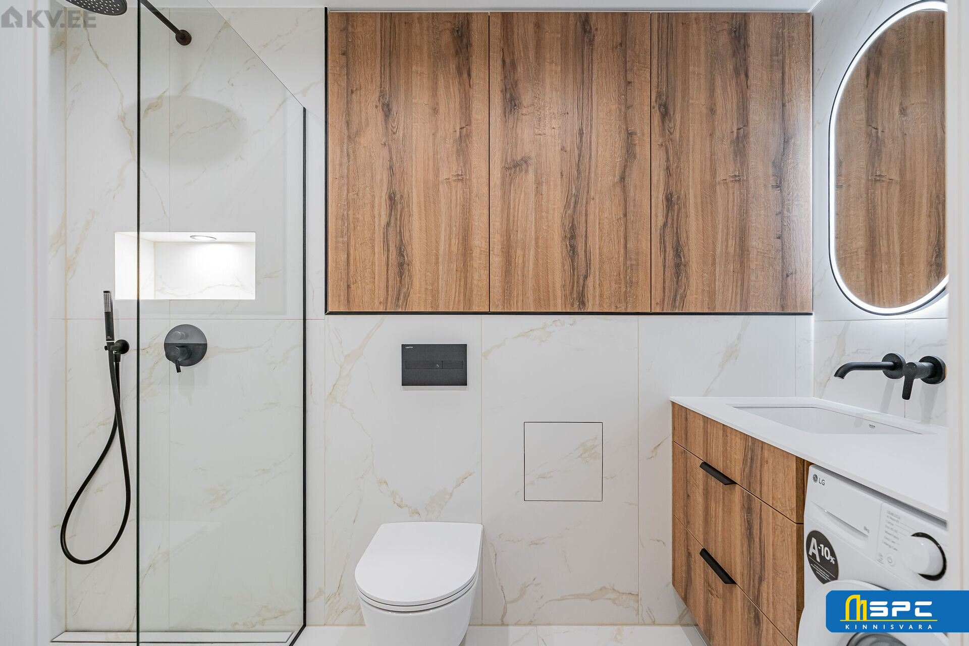– В стоимость полностью отремонтированной квартиры входят: выполненные на заказ три гардеробных шкафа; дизайнерские светильники; сантехника и обстановка ванной комнаты высокого класса (встроенный унитаз, смеситель и душевая зона; тумба с раковиной, стеклянная перегородка, дизайнерское зеркало с подсветкой); изготовленная на заказ кухонная мебель и качественная встроенная кухонная техника Bosch и стиральная машина.